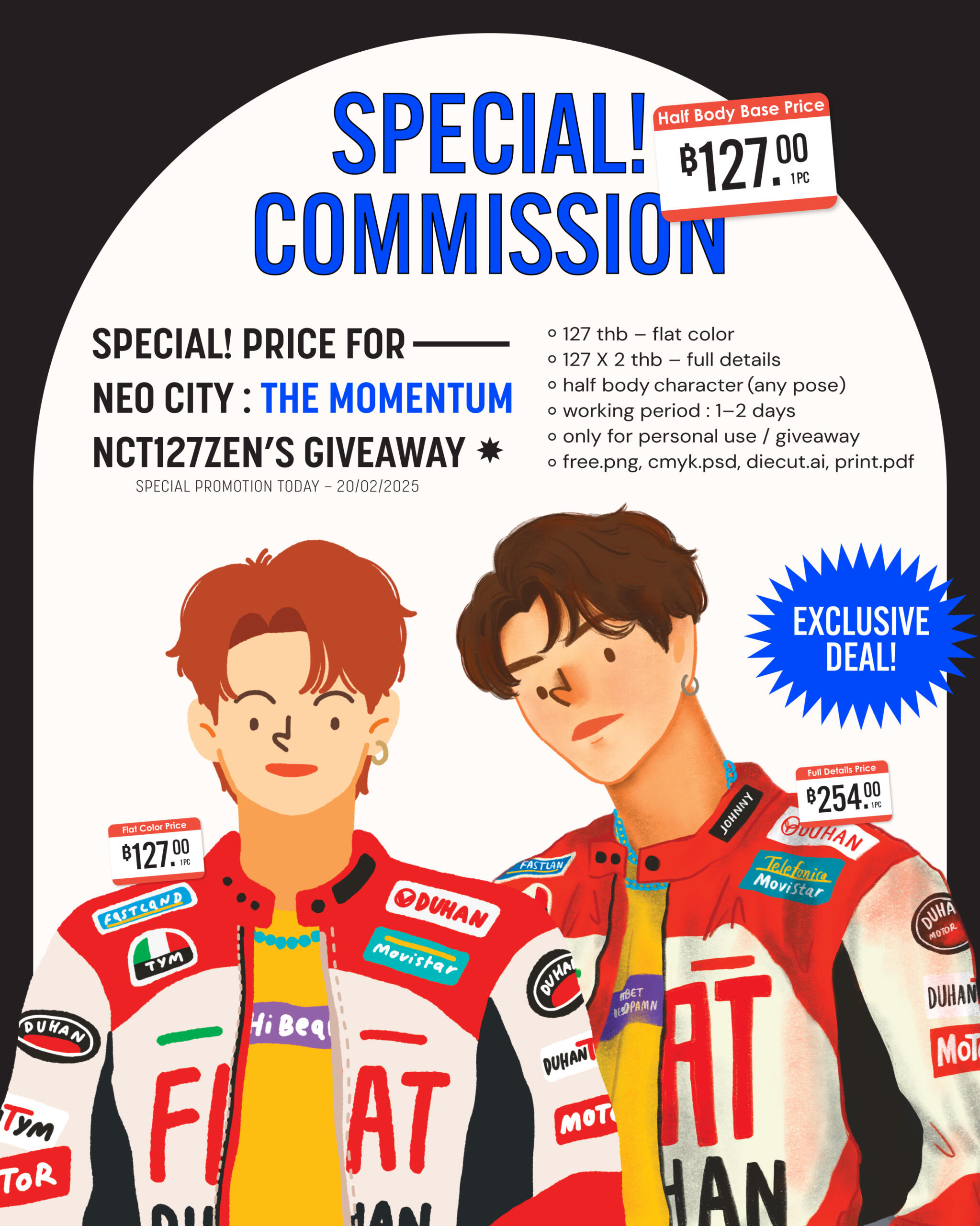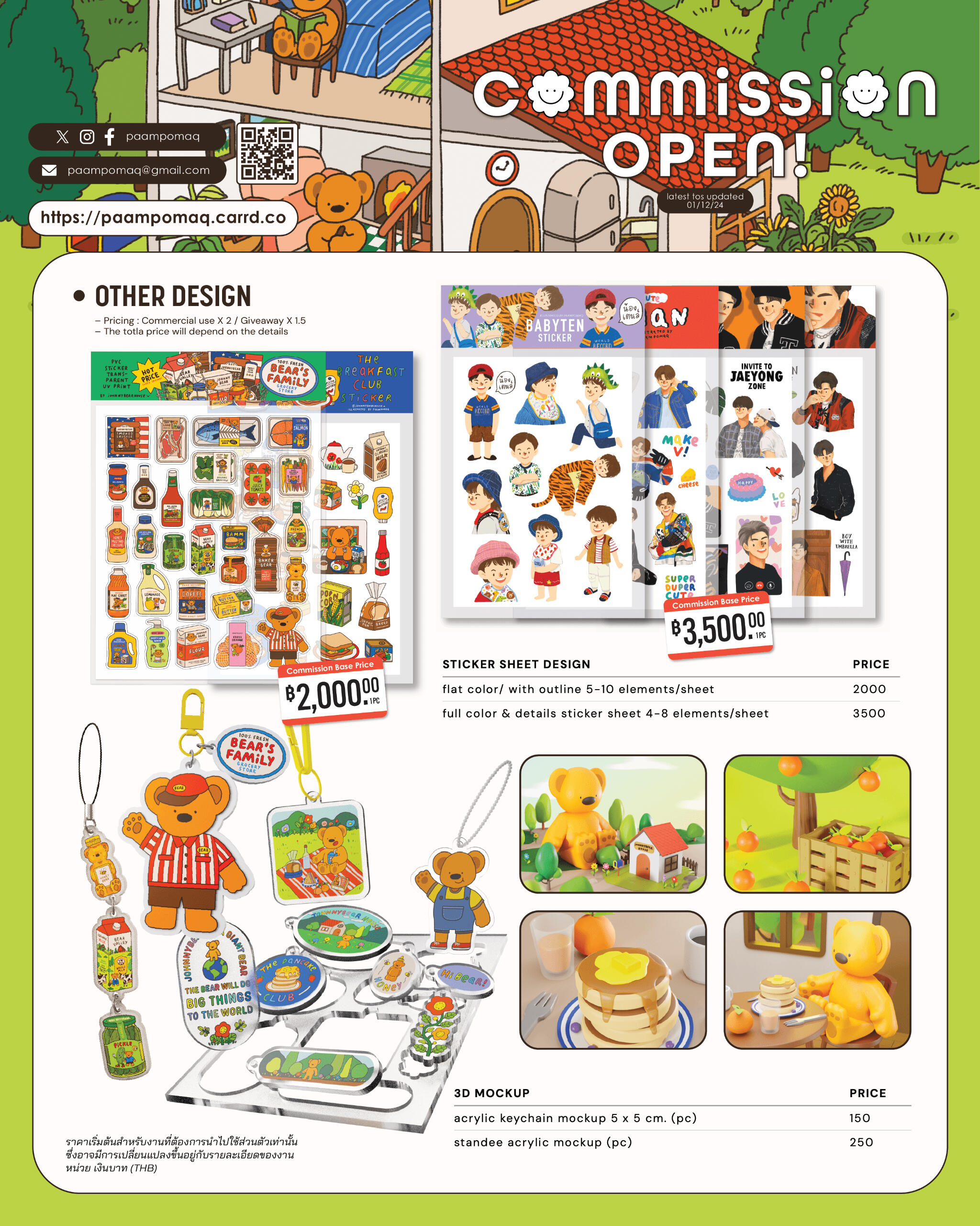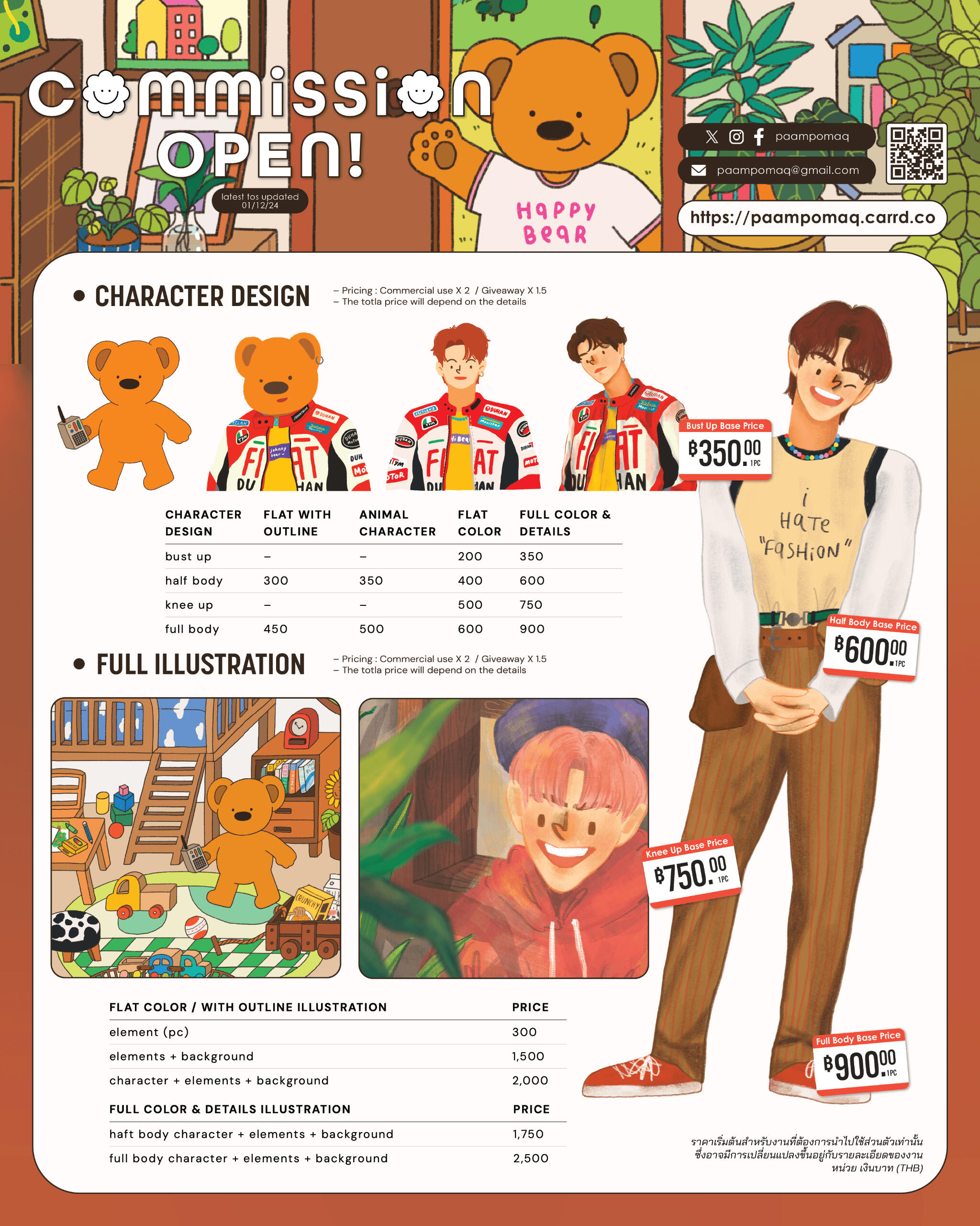 ราคาที่ระบุเบื้องต้นสำหรับการว่าจ้างในนามบริษัท องค์กร หรือนิติบุคคลประเภท Collaborationราคาที่ระบุเบื้องต้นสำหรับงานที่ต้องการนำไปใช้ส่วนตัว (personal use) ซึ่งว่าจ้างในนามบุคคลธรรมดาเท่านั้น โดย ราคารวม X 2 สำหรับงานที่ต้องการนำไปใช้ในเชิงพาณิชย์ (commercial use) หรือ ราคารวม X 1.5 สำหรับงานที่ต้องการนำไปใช้เพื่อการโฆษณาโดยไม่แสวงหาผลกำไรหรือทำสิ่งของเพื่อแจกฟรี (giveaway)การประเมินราคาเบื้องต้นยึดตาม Rate Card นี้เท่านั้น โดยอาจมีการเปลี่ยนแปลงเพิ่มเติมขึ้นอยู่กับรายละเอียดของงานกรณีว่าจ้างในนามบุคคลธรรมดา สามารถอ่านรายละเอียดเพิ่มเติมได้ทาง Rate Card